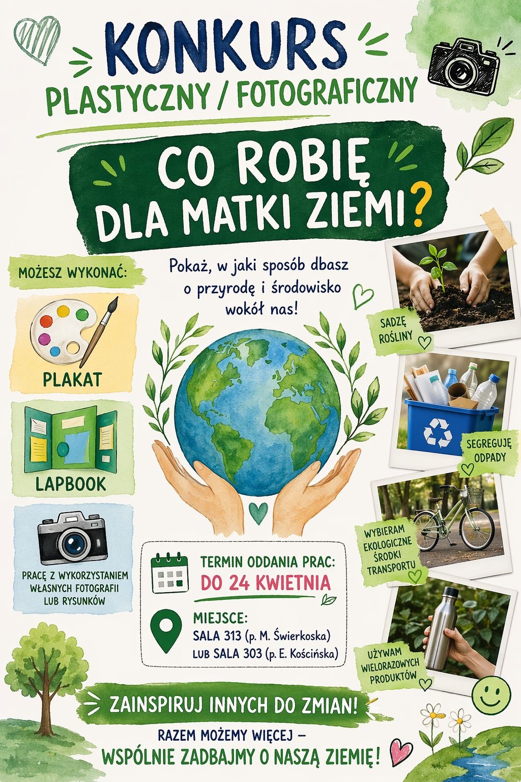 • Zachęcamy wszystkich uczniów do udziału w konkursie z okazji zbliżającego się Dnia Ziemi. To doskonała okazja, aby podzielić się swoimi pomysłami na ochronę środowiska oraz pokazać, jak każdy z nas może przyczynić się do dbania o naszą planetę.